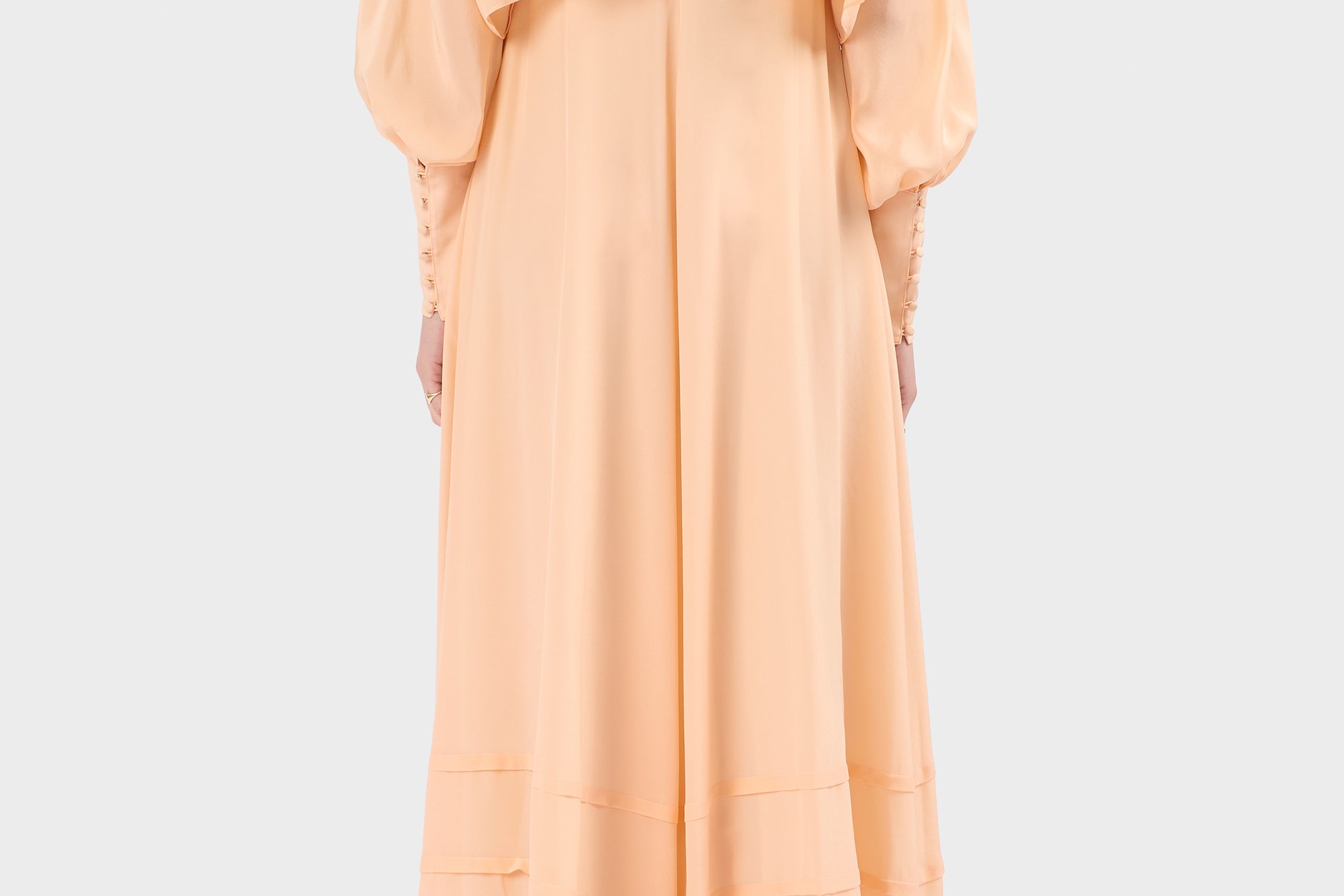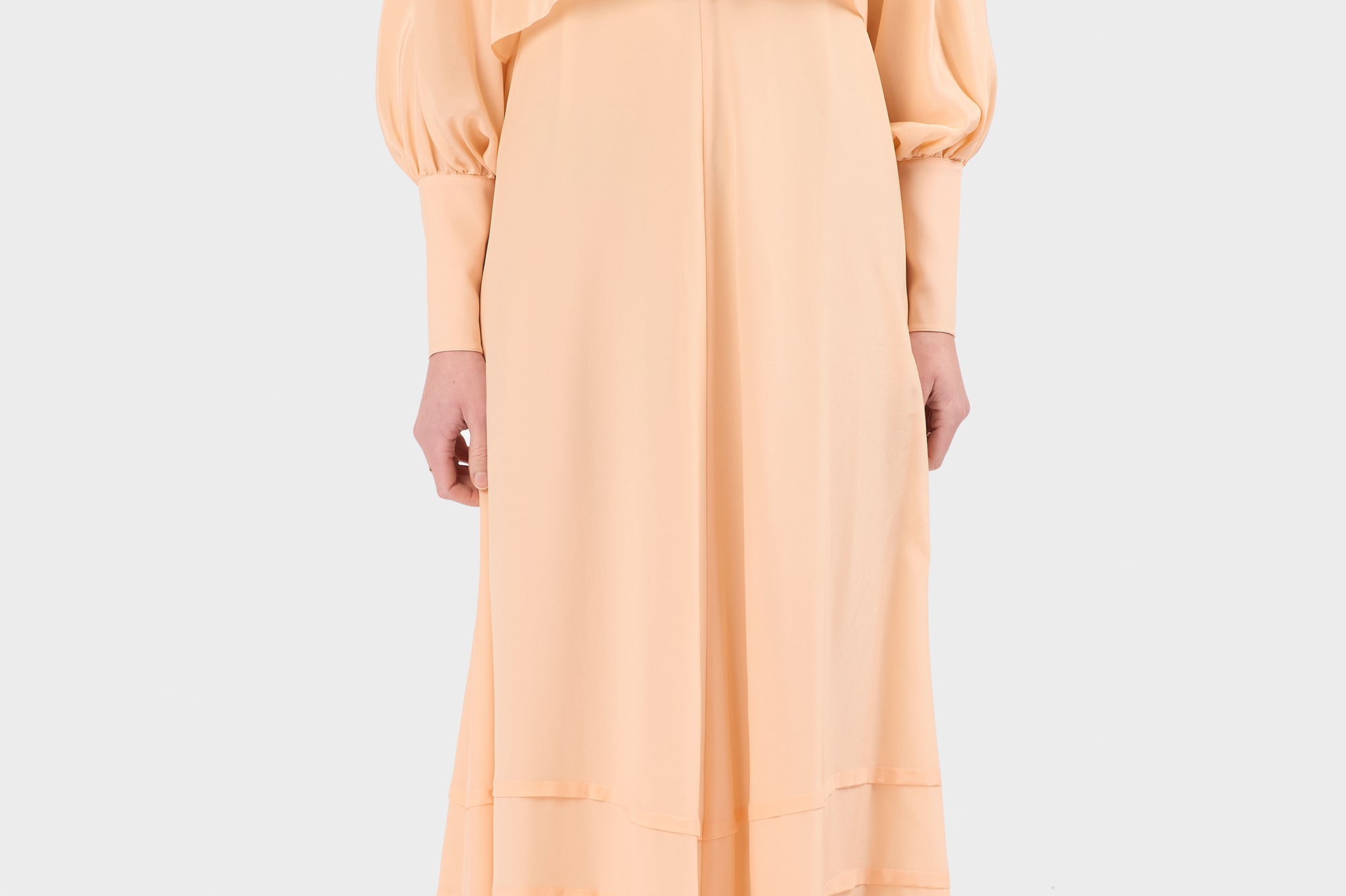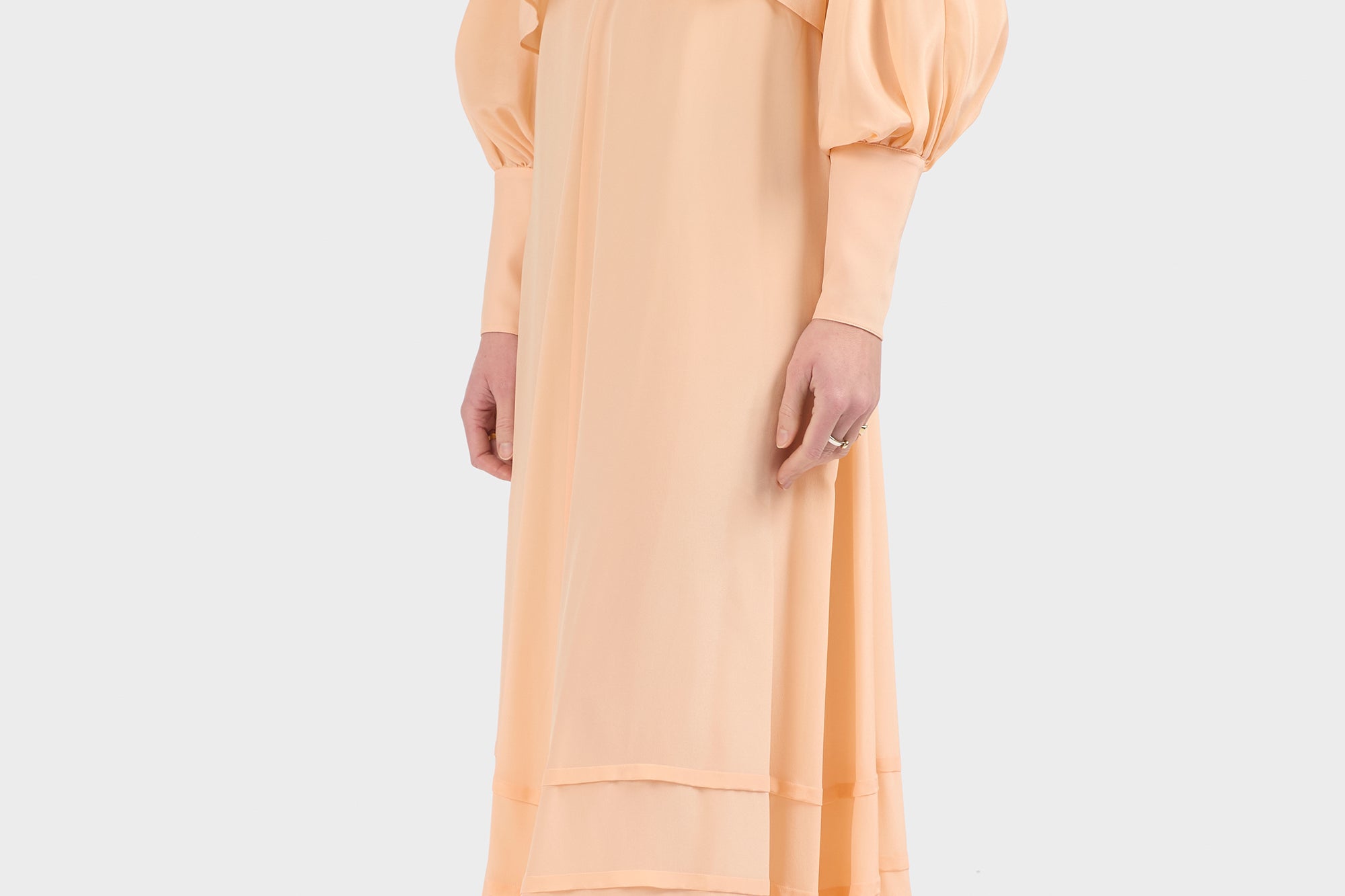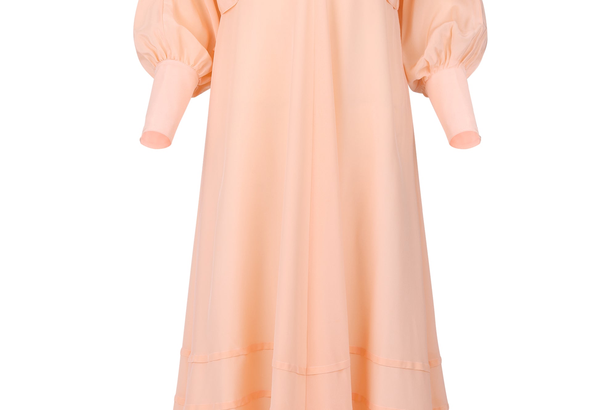 Parker's silk creates a sleek silhouette, and its bateau neckline is delicately framed by voluminous puffed sleeves. This versatile piece pairs beautifully with both sandals and over-the-knee boots.