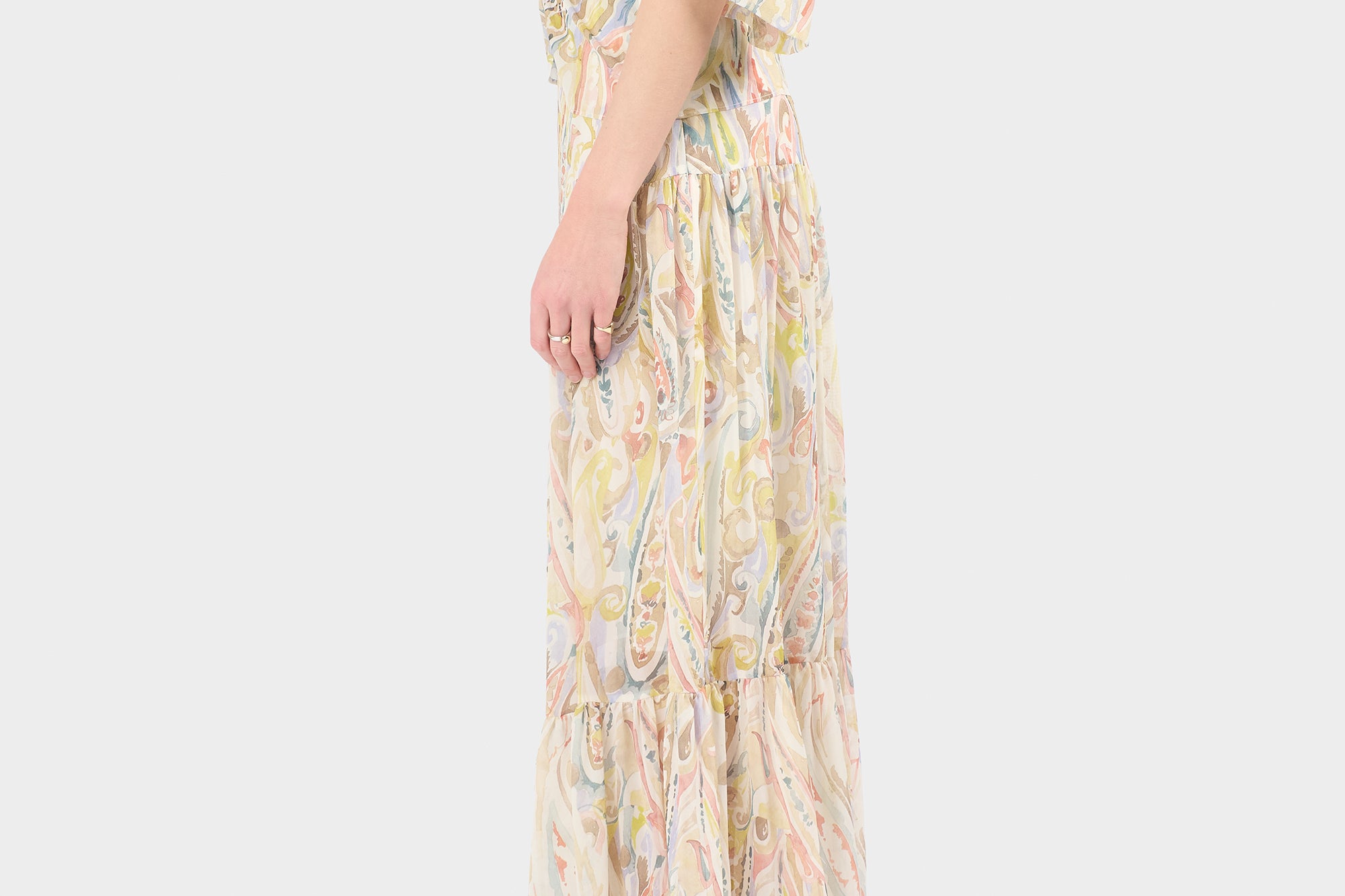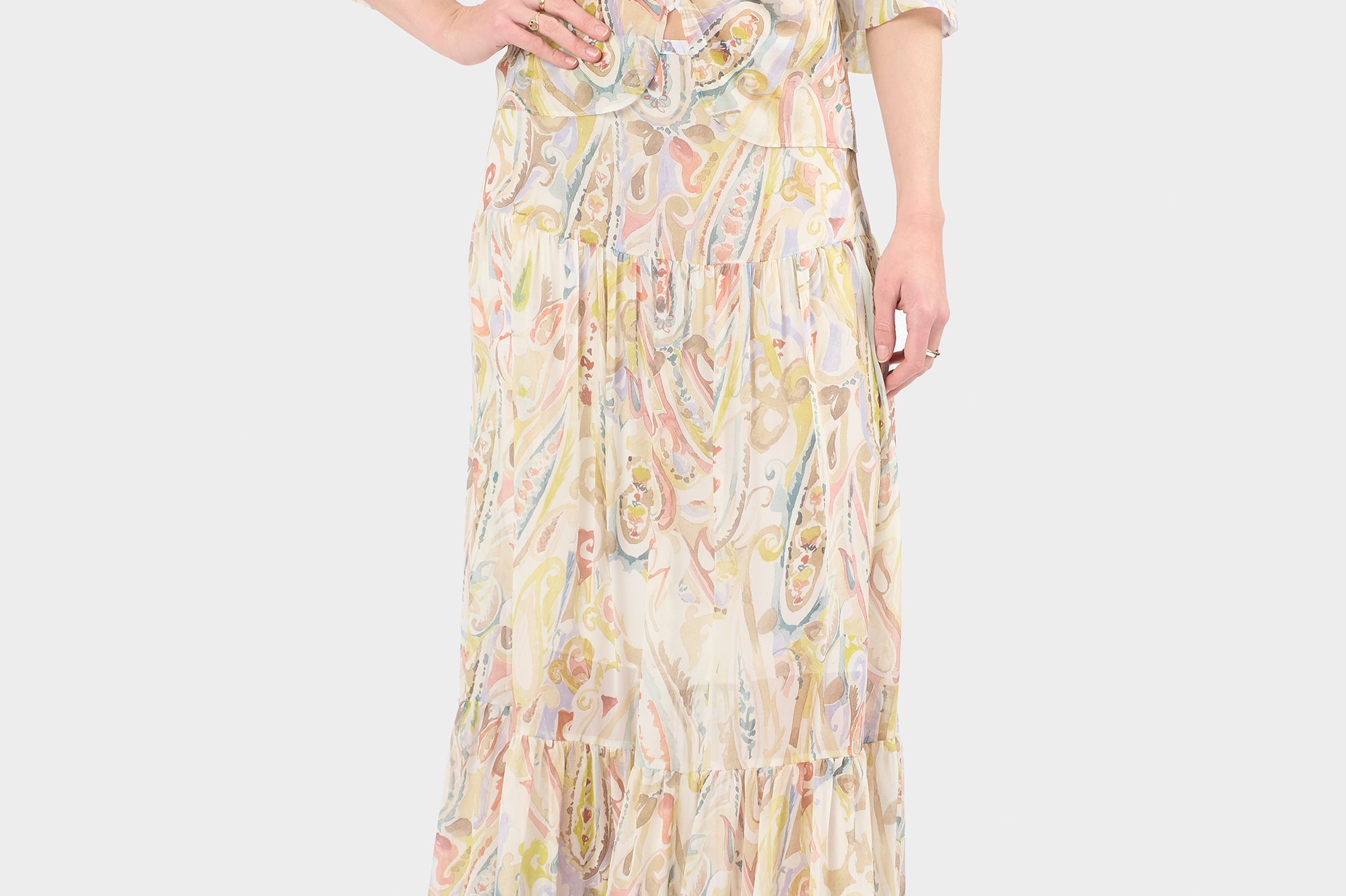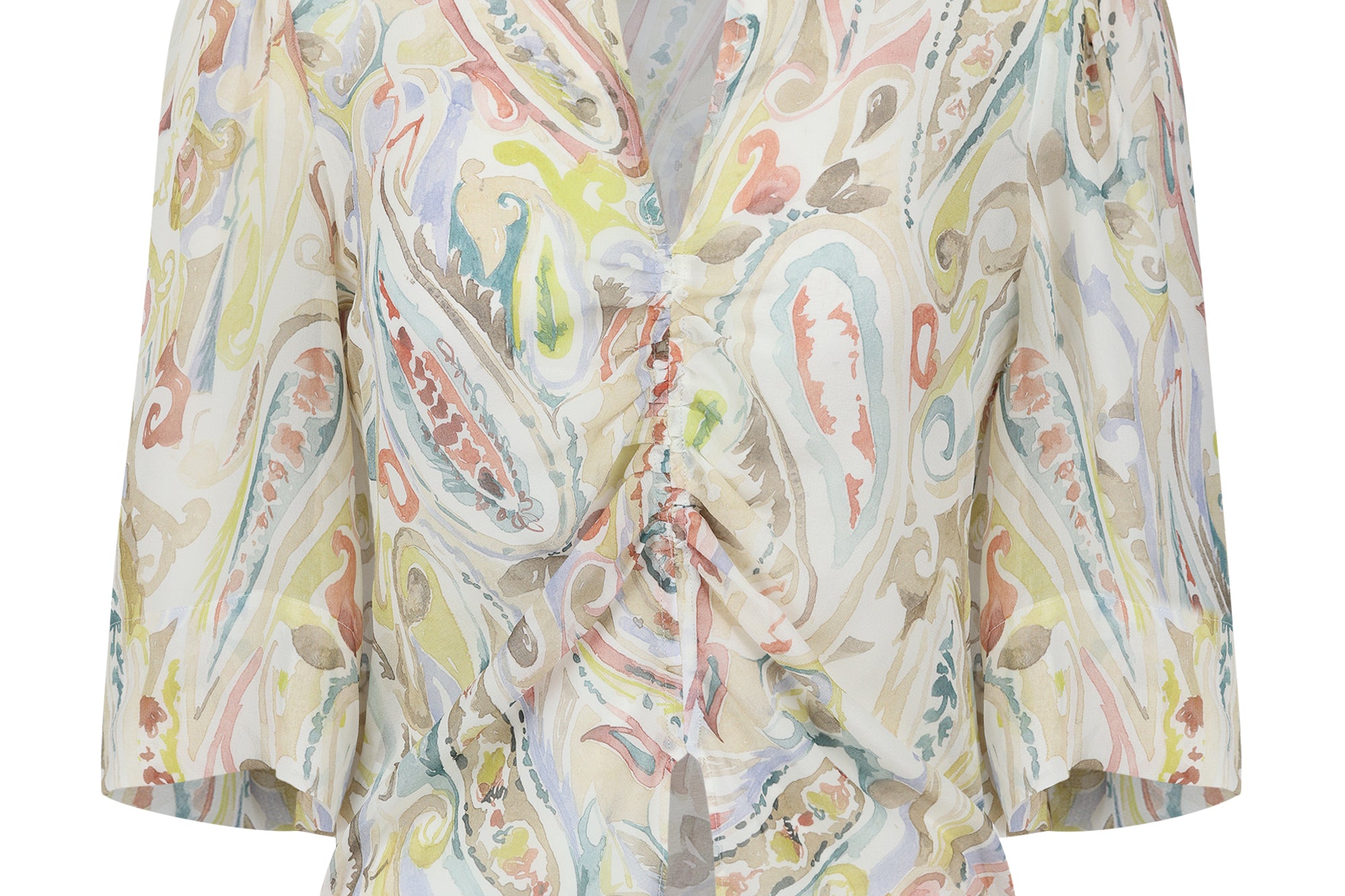 Careste's signature Winter Paisley print adorns Saffron, a delicate tulip hem top featuring a plunging v-neck and ruched button-front.